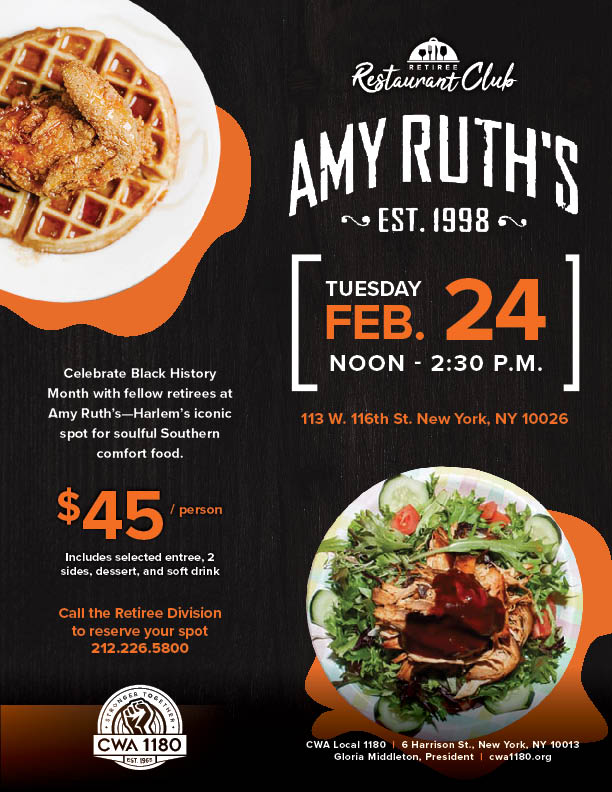 Restaurant Club - Amy Ruth's $45/person | Amy Ruth's Call the Retiree Division to reserve your spot today: 212.226.5800 | |